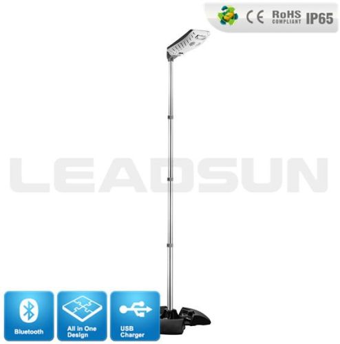 Automatically charge during the day.Connects wirelessly to any Bluetooth devices and enjoy your favorite music in stereo sound.Through our App, you can control the light or observe the working status via your smart phone.Super bright LED, more than 400 lumens.12+ hours for lighting or 4+hours for speaker after battery full charged.Recharge your mobile phone, tablet or other portable devices via the USB port .3m retractable lamppost and flexible lamp feet for easy handing.IP65 for ourdoor use.