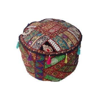 This unique Patchwork Embroidered ottoman is perfect as added seating, footrest, accent table and more. A stunning Color one-off exclusive design. True attention to detail. Fabulous home décor accessory. Made from carefully selected vintage saris, lenghas, bridal dresses, sequencesmirrorsshells. Hand stitched intricately to provide style and class to any room. Washing Instruction: Dry Clean Note:-As this is Applique Hand Patch Work, There will be variation in patches. Base Color will Be same.This Is Only Cover. Material:- 100 %Cotton Note: Cover only, Filler insert not included