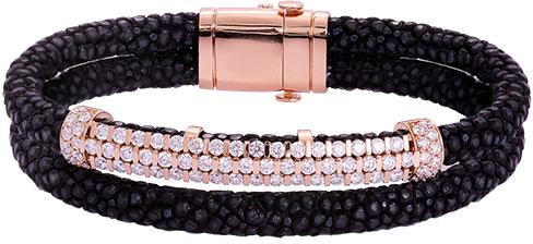 This bold bracelet features unique shaped accents embellished with diamonds set upon two hand-wrapped stingray leather cords that spiral around one another for a stylish twist. Shown here with 18k rose gold, DF-VS+ quality white diamond and black Stingray. The hardware is made of solid 18k rose gold hand set with 71 pieces of DF-VS+ quality white diamonds. You can choose the cord size that fits you best.