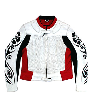 Leather. Front and Back with high grade perforated leather. Comfort Collar. Front Zip Closure with neck and bottom velcro closure loop. Two side zipper pockets. Zippered wrist cuffs with snap closure. Flowery overstitch screen printing on sleeves. Stretch Cordura under sleeves. Leather cut branding on back. Spandex on back. Adjustable back bottom with perforated leather. Attachable zip-out quilted liner. Inside Mesh lining with zip pockets and connected zipper.