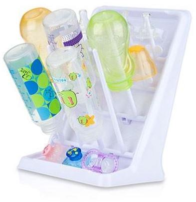 This Nûby™ Drying Rack holds up to eight bottles, as well as nipples, rings, discs and caps. It is also ideal for pacifiers and training cups. It comes pre-assembled. The sturdy drying posts securely lock into place for drying and fold down easily for storage. Just place on any flat surface, as the built-in reservoir holds the excess water for easy draining. * Bottles and other pieces shown above are for illustrative purposes only.