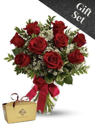 Somebody's gonna get a beautiful surprise. Imagine her smile when this lovely bouquet of roses arrives at her door - for no special reason at all. Except that you love her. You are going to be such a hero.This charming bouquet includes nine red roses accented with white waxflower, huckleberry and pittosporum along with a red satin ribbon. Delivered in a clear glass vase. This includes a box of Chocolates.