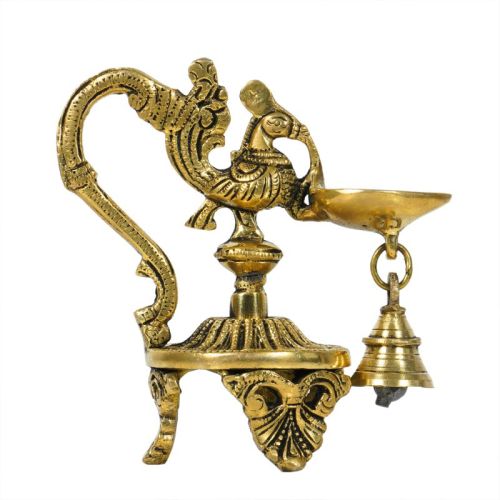 Brass Peacock Diya With Hanging Bell