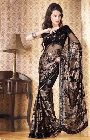 Elegant black colored brasso saree is offered by us. Intricately crafted using resham and sequins, the brasso saree in beautiful floral and patti patch work is widely demanded by the clients. The black colored brasso saree is available with matching blouse piece.