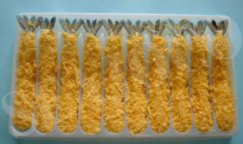 We are offering breaded shrimp. processing chart: black tiger shrimp washing peeling re-washing slightly belly cutting & stretching predusting dipping in batter mix covering with bread crumbs trays arranging freezing -40oc/2hrs metal detecting cartons packing storing at -18oc. Expiry date: 18 months from production date cooking method: defrosting not necessary, frying in cooking oil at 1700c –180oc from 3 to 5 minutes serving suggestions: fried products can be served with any of your favorite sauces such as chili sauce, tomato sauce and vegetables.