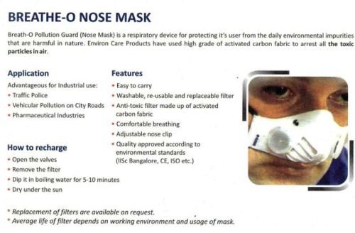 We are offering breath o pollution guard {nose mask} is a respiratory device for protecting it's user from the daily environmental impurities that are harmful in nature manufactured with high grade of activated carbon fabric ton arrest all the toxic participial in air.