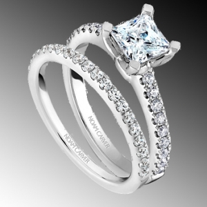 noam carver bridal engagement ring. 14k white gold mounting with 27 points of brilliant diamonds. *(center diamond priced separately) also available in 14k, 18k white, yellow and rose gold and platinum. please call for prices and allow 2 weeks for delivery. matching diamond band has 32 points of diamonds -