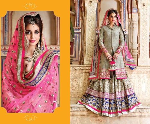 We are offering bridal lehenga. The lehenga and choli are in steel grey, and the dupatta is in pink. Heavily embroidered and diamond-studded lehenga with gorgeous embroidered jacket. Comes with heavily embellished and hand worked dupatta and stylish wristlet bag.