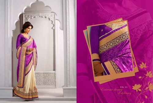 We offe rBridal saree. Product Description:This off white & Perple colored embroidered print Brocket Saree has an intricate detailing work on its main portion. The lower portion of this bridal saree includes eye catchy flowery design with superb borders. One can attain complimenting views in all the occasions through this marvelous collection as it got faux georgette fabric. Saree Length: 5.50 m, Blouse Material: 0.8 m