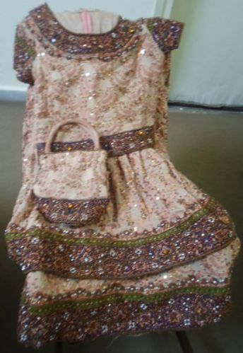 We offer Bridal Saree. fabric:crincle chaifon self print. colour skin and peach patches wih green and purple. saree style, use only 4 to 5