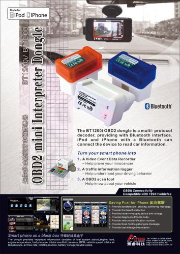 BT200i OBD2 dongle is a multi-protocol decoder, providing with Bluetooth interface. BT1200i is compatible with iPhone, iPod and iPad. It supports both iOS and Android System. BT1200i is able to support over 5000 vehicle models in the world.