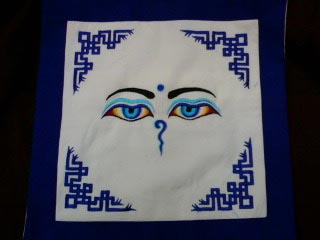 100% cotton with back open for cushion stuffing. Auspicious buddha eyes pattern embroidery on middle of cushion as design by permanent color silk threads