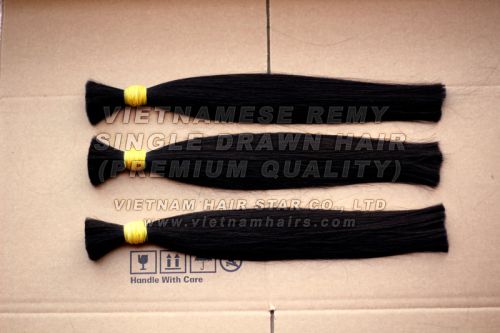 We are offering vietnam hair single drawn hair bulk hair. 100% real human hair, no henna. 100% natural hair (no treatment with chemical, not dyed, not bleached). 100% remy hair (no tangled, all hairs are same direction from top to bottom). Only washed with shampoo. No lice, no nits. Quality of hair: thin, strong, soft and silky. Color: natural black (#1, #1b, #2). Texture: straight.