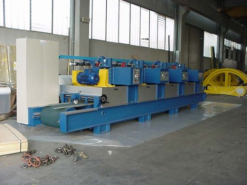 Calibrating machine, used to gauge granite strips by means of adjustable calibrating spindles, wich can swivel by 45°, so that the diamond rolls  can be used with different size.useful width 70 cm, n. 4 heads
