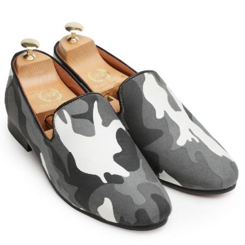 Handcrafted camouflage fabric slipons with leather lining for comfort and handcut hardsheet sole for grip.