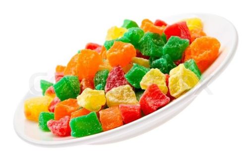 Candied fruit, also known as crystallized fruit or glacé fruit, has existed since the 14th century. Whole fruit, smaller pieces of fruit, or pieces of peel, are placed in heated sugar syrup, which absorbs the moisture from within the fruit and eventually preserves it. We supply in different packing and different types. Contact us for further details.