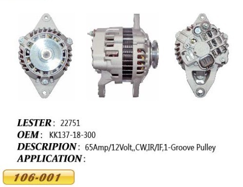 We are offering car alternator. Lester:22751 oem:kk137-18-300 description:65amp12volt,1-groove pulley application:kia pride each one provide one year warranty