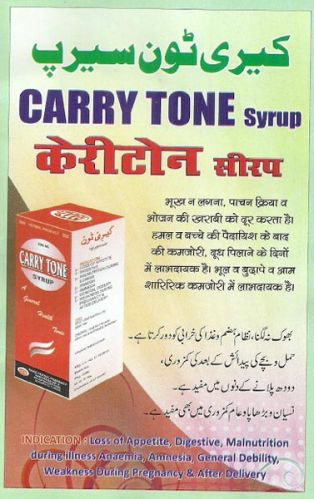Get in touch with us and acquire the finest quality Carry tone Syrup at modest prices! The Carry tone Syrup that we bring forth is prepared under the most hygiene conditions, at our vendor’s end. Our Carry tone Syrup is very much effective in loss of appetite, general debility, etc. Be it a small order or a bulk one, we assure you to deliver the same within the given time-span. From Madhya Pradesh, India, we are trustworthy Supplier of Carry tone Syrup.