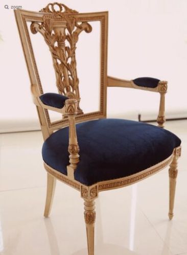 A plush, blue velvet upholstery contrasting with a rich, gold and crème finishes of the wood. Contrasting and enhancing the delicate carving of the back. A chair which is a piece of art and yet the comfort is unbeatable.