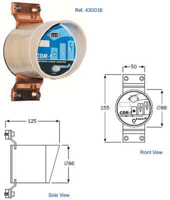 DESCRIPTION : • Logs the lightning strikes which occur within the external lightning protection system.• Complies with the requirements set forth in the standards:    UNE 21.186     NFC 17.102     EN 62.305 • Range of Intensity:  1 kA (8/20 µs) - 100 kA (10/350 µs), according to EN 50.164/6 •Valid for: Cable 50-95 mm², Rod Ø 8-12 mm, Tape 30x2 mm.
