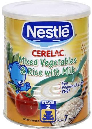 Stage 2. Iron. Vitamin A,C,B12. CHE. Infant cereals from 7 months. Rice based vegetables flavoured infant cereal with milk powder. Suitable for vegetarians. Nestle Cerelac rice & vegetables with milk is highly nutritious for babies from 7 months onwards when breast-mil