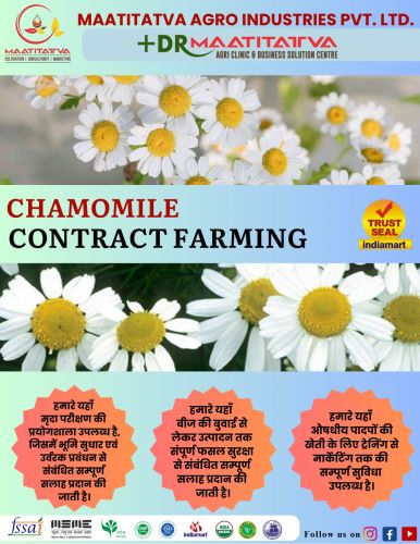 Contact SupplierChamomile (Matricaria chamomilla), often called the “golden flower,” is one of the most profitable medicinal and aromatic crops, widely used in herbal teas, cosmetics, essential oils, and Ayurvedic as well as pharmaceutical formulations. At Maatitatva Agro Industries Pvt. Ltd., we offer farmers a complete Chamomile contract farming model, ensuring access to superior planting material, scientific cultivation practices, and assured buy-back at pre-decided prices. Chamomile is a low-input crop that thrives in varied agro-climatic conditions and offers high returns due to its strong demand in domestic and international herbal markets. Through our expert guidance and market support, we help farmers achieve consistent yields, reduce cultivation risks, and tap into the booming herbal and wellness industry. Partnering with Maatitatva Agro Industries Pvt. Ltd. ensures a secure, profitable, and sustainable farming venture with Chamomile.