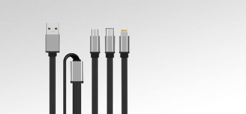 Specifications  Tangle-free Aluminium Finish 1.2-meter long cable 2A Fast Charging Rugged & Durable Extensively Tested Color: Black/Grey   Features  3 in 1 Charging Cables Connector: Micro, Lightning & Type-C Material: TPE Wire + Aluminum Alloy Connector Output: 2A