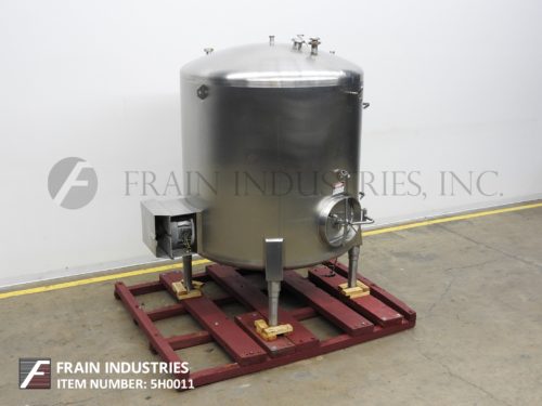 Cherry Burrell, Model CV, 1000 gallon, 304 stainless steel, single wall tank. Vessel Dimensions: 65" diameter x 80" deep with a 64" straight wall. Equipped with dome top, 20" x 16" side entry bolt down man way and bottom side mounted 16" diameter prop agitation powered by a 1½ hp drive. Dish bottom with 2½" OD 2"ID seated bevel style bottom discharge with 11" floor clearance. Mounted on (4) tube legs. Top Access: (2) 2½"OD 2"ID Seated Bevel (2) 2"OD 1½"ID Seated Bevel (1) 3" Open Vent Side Access: (1) 2"OD 1½"ID Tri-clamp