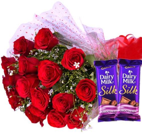 Make someone feel special by giving this beautiful bunch of red roses. The combo consists of freshly plucked 15 Red Roses beautifully wrapped in transparent cellophane paper and ribbon. This beautiful Rose bunch is also clubbed with 2 delightful Dairymilk Silk Chocolate packs each weighing 60gm which make it a perfect gift to greet someone at any special moments of celebration.