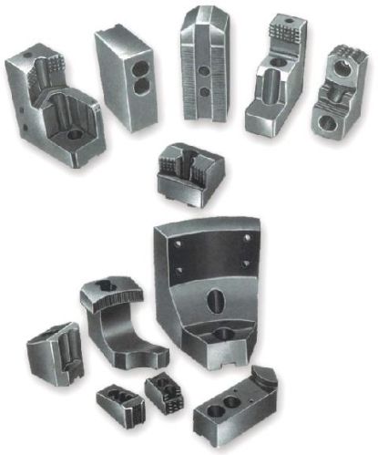 All the soft jaws are made of high carbon steel. The hard reversible jaws are made of case hardened steel. Hardened and ground, they are provided with diamond serrations for a firm grip. The form ground serrations range from 1/16" x 90°, 3/32" x 90°, 1.5x 60°, 3.0 x60°. Special jaws are offered to customer's specifications or to suit customer's components.