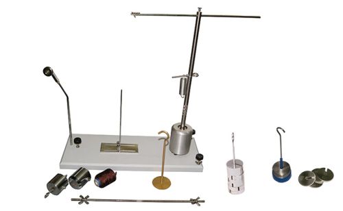 CIRCULAR FORCE APPARATUS are attached to a horizontal bar mounted a top a vertical shaft about 45cm high,and the vertical shaft ties the suspended mass with a horizontal spring. When the shaft is spun ,the suspended mass swings away. The displacement at any given speed is marked by a vertical mounted pointer which moves laterally to match the pointed tip of the suspended mass. By knowing the mass