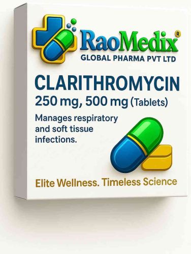 Contact SupplierWe offer Clarithromycin Tablets in a pack size of 10 X 10 tablets, each tablet containing 250 mg of Clarithromycin. These tablets are designed to manage respiratory and soft tissue infections effectively. The tablets come in strips packaging for convenience. Manufactured by RaoMedix Global Pharma Pvt Ltd, a reputable exporter, supplier, and trader in the pharmaceutical industry.