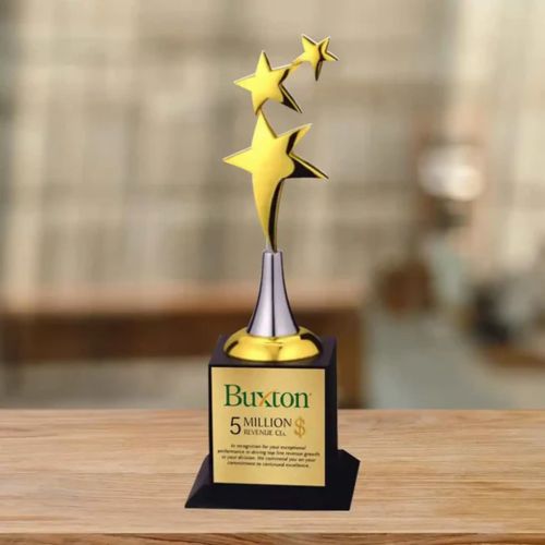 A cherished keepsake of achievement and a gleaming symbol of hard work and achievement, this presto's Classic 3-Star Golden Triumph Trophy is felicitous for all corporate events. Specifications Body Material: Metal Base Material: Wooden with printed Metal sheet Size: 27.94 CM GST: 12% (Included in Product Price) Printing Method: Sublimation Vivid Printing on Imported Metal Plate