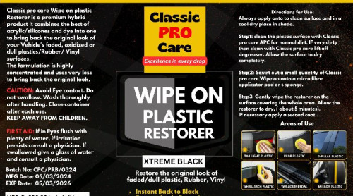 Contact SupplierClassic pro care Wipe on plastic Restorer is a premium hybrid product it combines the best of acrylic/silicones and dye into one to bring back the original look of your Vehicle's faded, oxidized or dull plastics/Rubber/ Vinyl surfaces.