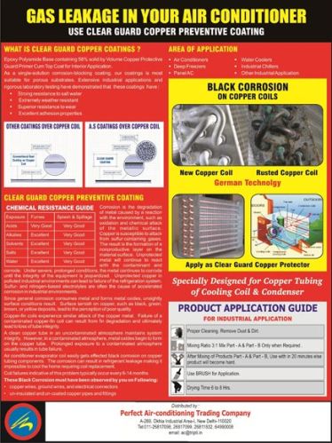 Clear guard copper preventing coating to save your aircondtiioners,dehumidifiers,deep freezers,chillers and other refrigeration equipment from gas leakage