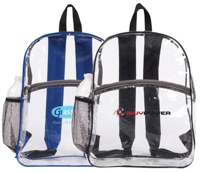 Clear backpack with colored trims and grey zippers, It features adjustable padded back straps, Large front zipper pocket, Side mesh pocket for water bottle, Perfect for schools, camps, cruises, and other promotions. 12" W x 15.25" H x 4" D