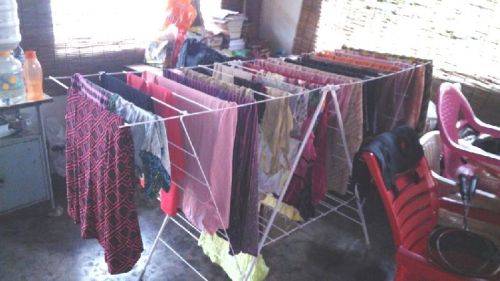 Country style manufacturing enterprises manufactures home products. One of the products is cloth drying stand. This product is 100% metallic fabricated product. No plastic parts involved except leg bushes. This product can accommodate more than fifty clothes. This product is given two industrial paint coats plus one gloss coat to avoid rust and to have a long life. This product is foldable type. When expanded the span length is 182 cms. This product is easy to handle.