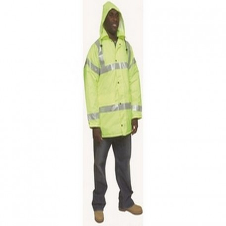 2″ Silver Reflective Tape On Front and Back Heavy Insulated High Visibility Lime Mid-Length Coat Collapsible Hood with Drawstrings For Added Versatility Reinforced Seams For Strength And Durability
