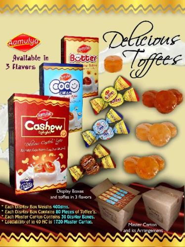 Amulya Delicious Toffees very tasty and good appearance.Our Amulya Toffees available in many flavours like Butter , Coco Cream and Cashew delight flavours.