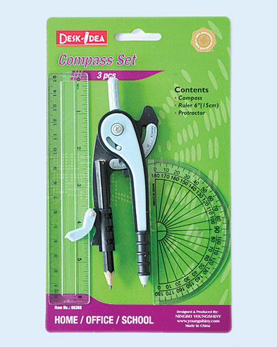 1 set contains 1 compass, 1 ruler 6"(15 cm) and 1 protractor. Suitable for school and office uses. This is a product from China with good feedback in the market.