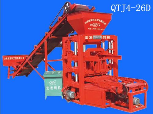 We are offering concrete block making machine. Qtj4-26d block machine it can make hollow brickļ¼solid brick and pavers by changing moulds. main parameter of qtj4-26d brick machine main technical specifications overall dimension 2060*1730*2580mm power 12.25kw molding pieces 400*200*200 4pcs/mold 390*240*190 3pcs/mold productivity 4000-5000pcs/day cycle time 26 seconds vibrating frequency 4200 rolls/minute exciting power 35.5kn pallet