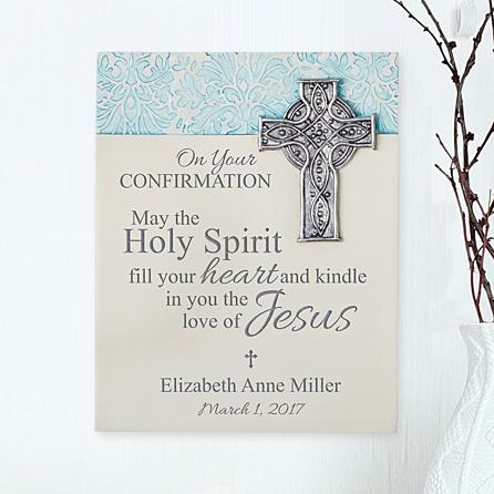A Personal Creations Exclusive! This Celtic cross and simple prayer are the perfect reminder of the day they confirmed their faith in Christ. Made of resin and stone. Wipe with dry cloth. Features keyhole for easy hanging. Engrave with any name up to 28 characters and date. Measures 7-14"Wx9"Hx1"D. Item