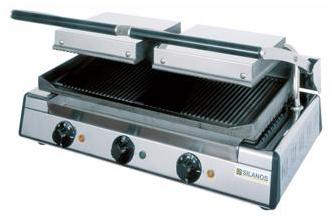 Double Cast iron contact grill. Stainless steel case material. Burner heating element type. Mechanical control system. Power 3.5 kW - 230V/1-50Hz. Maximum temperature is 300oC. Made in Italy.