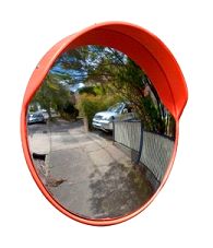 Convex Mirrors are made of Polycarbonate Sheet . Outdoor use with Hood , made of STUDLY Plastic wityh Mounting Kit . Available Sizes : 45cm , 60cm , 80cm , 100cm