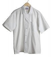 Classic, snap front cook shirt. 29" long for fuller coverage. White 4.5 oz. polycotton poplin. Left chest pocket. 38" stainless snaps. 29" length (from center neck)