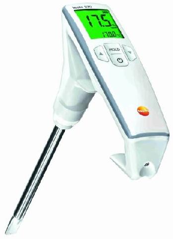 The cooking oil tester testo 270 measures the quality of cooking oil easily, quickly and with reliability. The new testo 270 has an ergonomic design, which prevents the direct exposure of the hand to the hot oil.The clear alarm via the colored backlit display makes it easier to evaluate the cooking oil quality: Green would means the TPM content to be acceptable. Orange: TPM value is borderline. Red: The TPM limit has exceeded the acceptable limits and the oil should not be used anymore.