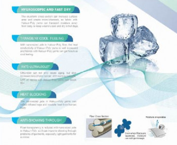 Contact SupplierHYGROSCOPIC AND FAST DRY The cruciform cross-section can increase surface area and create micro-channels, so fabric with Hakuu-Poly yarns can transport moisture away from body to keep wearers cool and dry in hot days. TRANSIENT COOL FEELING With nano-sized jade in Hakuu-Poly fiber, the heat conductivity of Hakuu-Poly yarns is well increased and fabrics with Hakuu-Poly yarns can get fabulous cool feeling. ANTI-ULTRAVIOLET Ultraviolet can not only cause aging, but also increase risks of skin cancer. With nano-sized jade, UPF of fabrics with Hakuu-Poly yarns can reach 50+. HEAT BLOCKING The nano-sized jade in Hakuu-Poly yarns can reflect infrared rays and insulate heat from human body. ANTI-SHOWING THROUGH Fiber transparency is reduced with nano-sized jade in Hakuu-Poly, so it can help to improve showing through problems of garments, especially light garments for summer. PRODUCT RANGE: 1.Spun Yarn: Count:16/1s - 80/1s Ratio: 100% Hakuu-Poly, Hakuu-poly belended yarn Core spun yarn also available. 2.Filament: 50D/72F, 75D/72F, 100D/144F, 150D/144F.