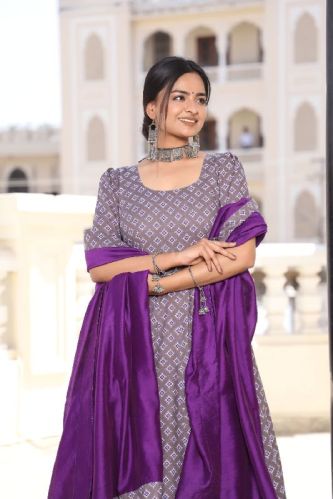 BANDHEJ COTTON floor length dress having elbow sleeves and chanderi silk dupatta having printed border at all over dupatta.