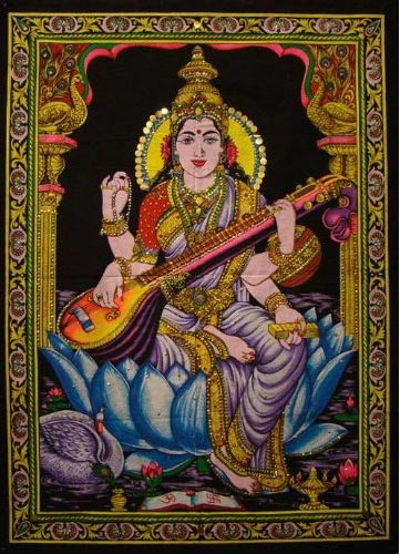 We are offering huge heavy cotton canvas goddess saraswati wall hanging tapestry. A great wall hanging for yoga class rooms or centers to protect you and your family. Hang it on the door of your sacred room or any corner of your room - it will definitely bring wisdom, wealth, harmony and peace to your family and friends. It measures approximately 40" high x 30" wide