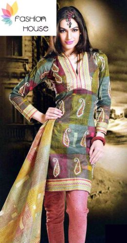 rich soft cotton with cotton dupatta. 2.5 mtrs For bottom and top, 2.25 mtrs for dupatta, available 30 designs per catalog, color and fabric guaranteed.